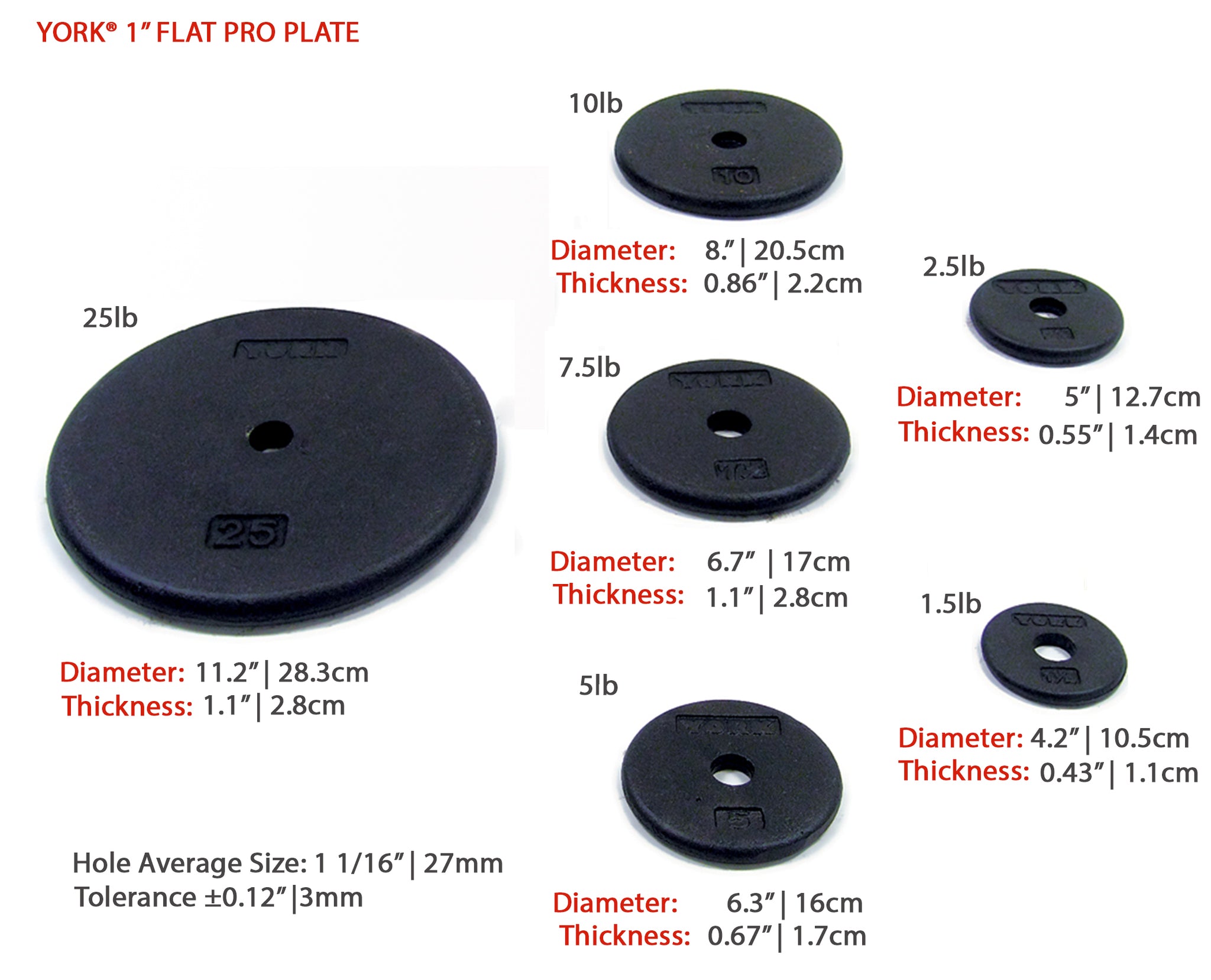 The 1” Standard Flat Pro Cast Iron Plate, the “pancake plate”, is a simple plate that offers a variety of sizes. These plates can be used with our 1” dumbbell handles to make an adjustable set of dumbbells in order to help conserve space or with any equipment that utilizes standard plates. The Standard Flat Pro Cast Iron Plates are composed of durable cast iron which helps these plates last a lifetime.