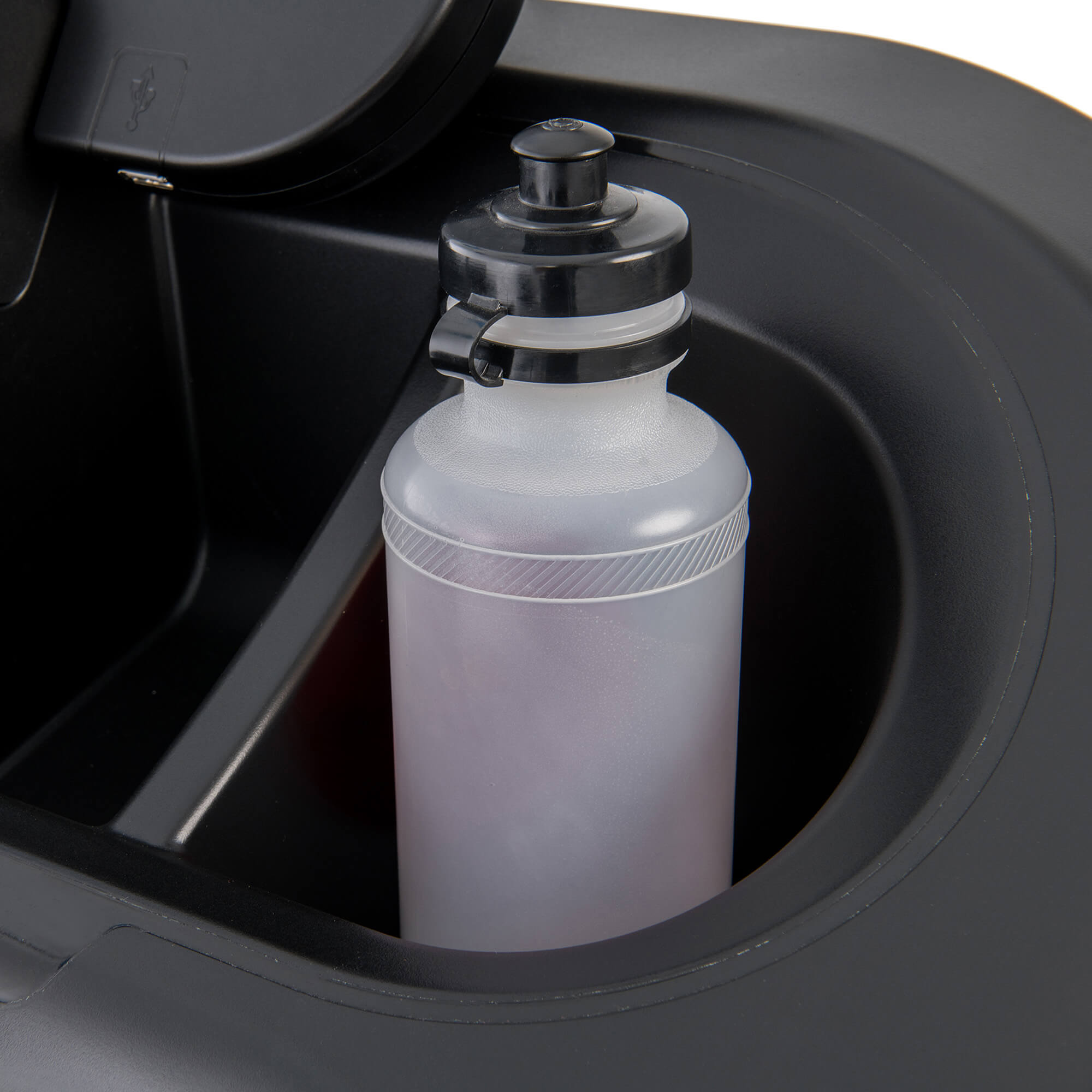 Console features an adjustable fan, cell phone ledge, small storage tray, tablet-friendly reading rack, bottle holders, USB charging port and more.